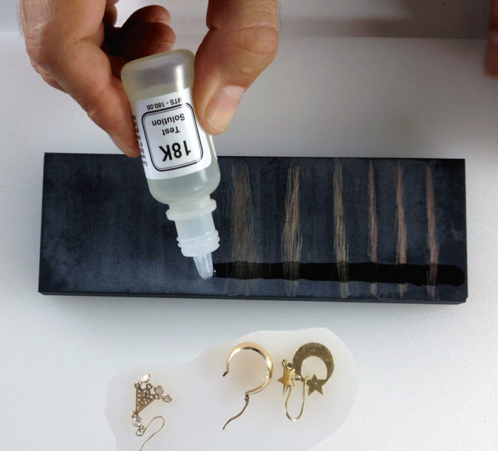 در این روش، قطعه مورد نظر بر روی سنگ محک کشیده شده و سپس محل تماس با محلول اسید مخصوص آزمایش میشود. طلای اصل بدون تغییر باقی میماند، اما ژوپینگ معمولاً روکش خود را از دست داده و فلز پایه آن نمایان میشود. این تست یکی از روشهای سنتی و قابل اعتماد در بازار طلا و جواهر است.
